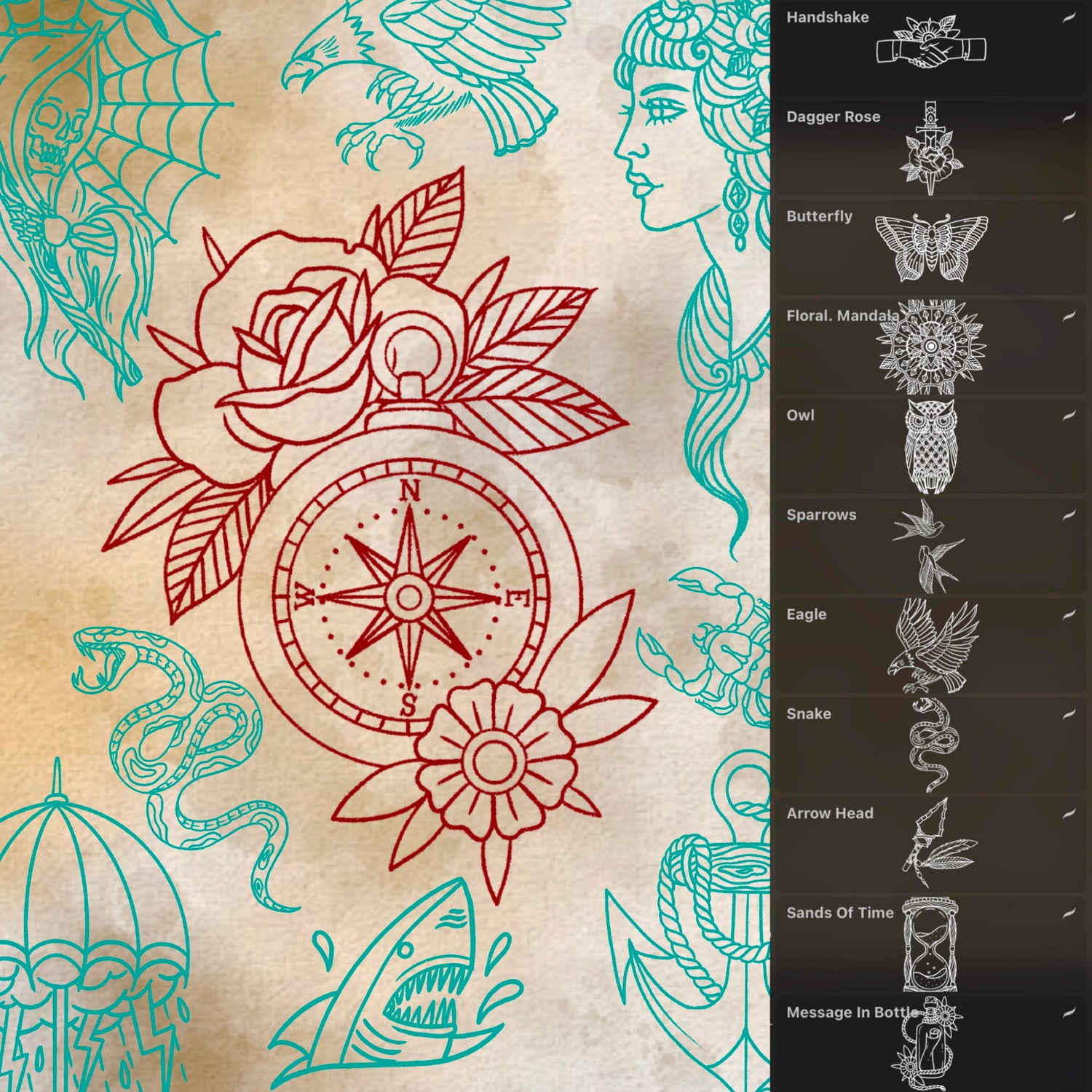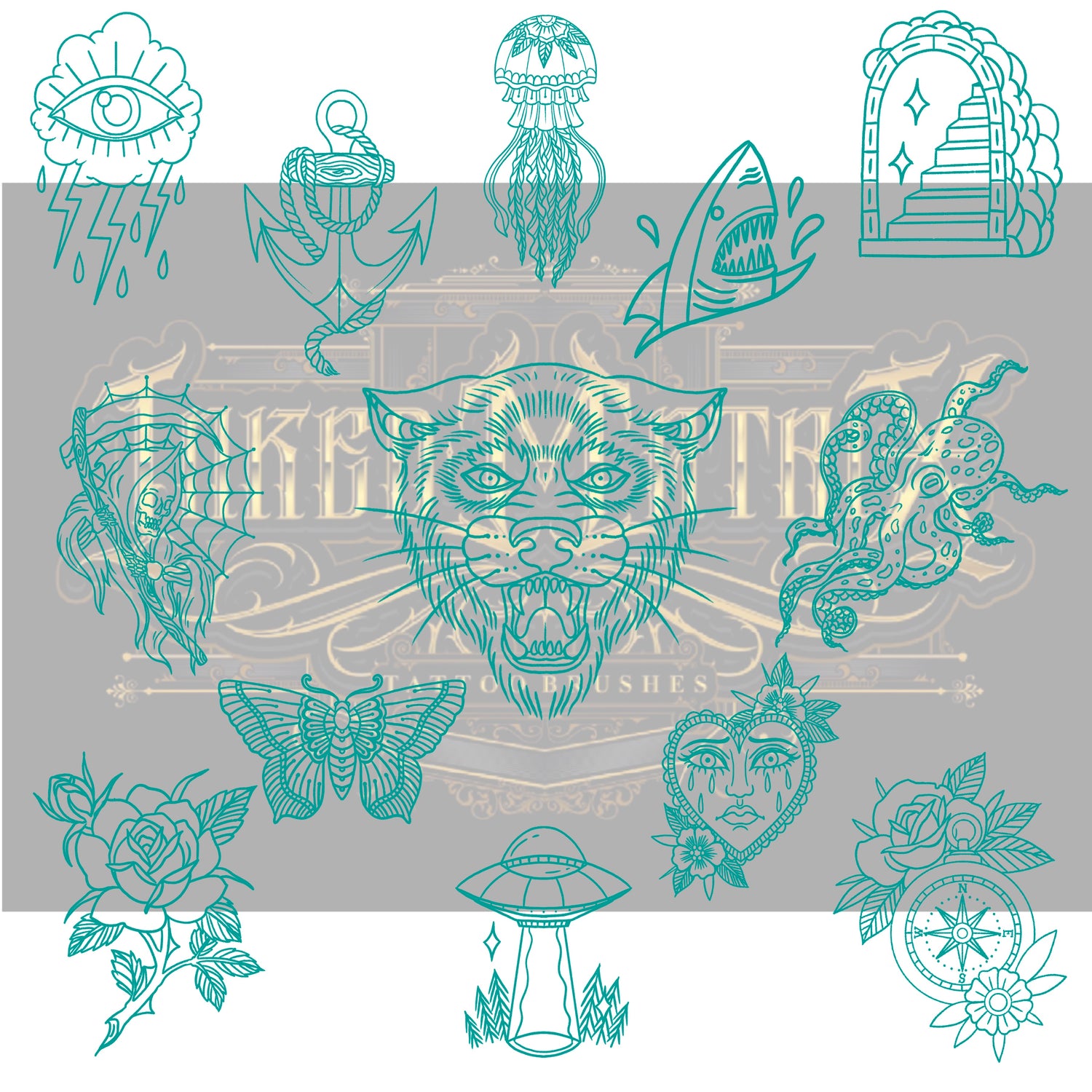 35 premade traditional tattoo designs. These flash stamps are ready for color or black and gray. They can also be added to enhance your existing tattoo flash as add-ons, fillers, foreground concepts, or background content. Designs include eagle, snake, wolf, scorpion, rose, shark, lighthouse, and many other unique ideas.